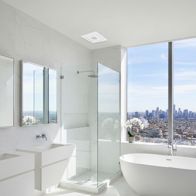 Side-ducted exhaust fan with a square grille with built in draft stopper and 10W tri-colour LED download. AC plug and lead included, qualified electrician required.