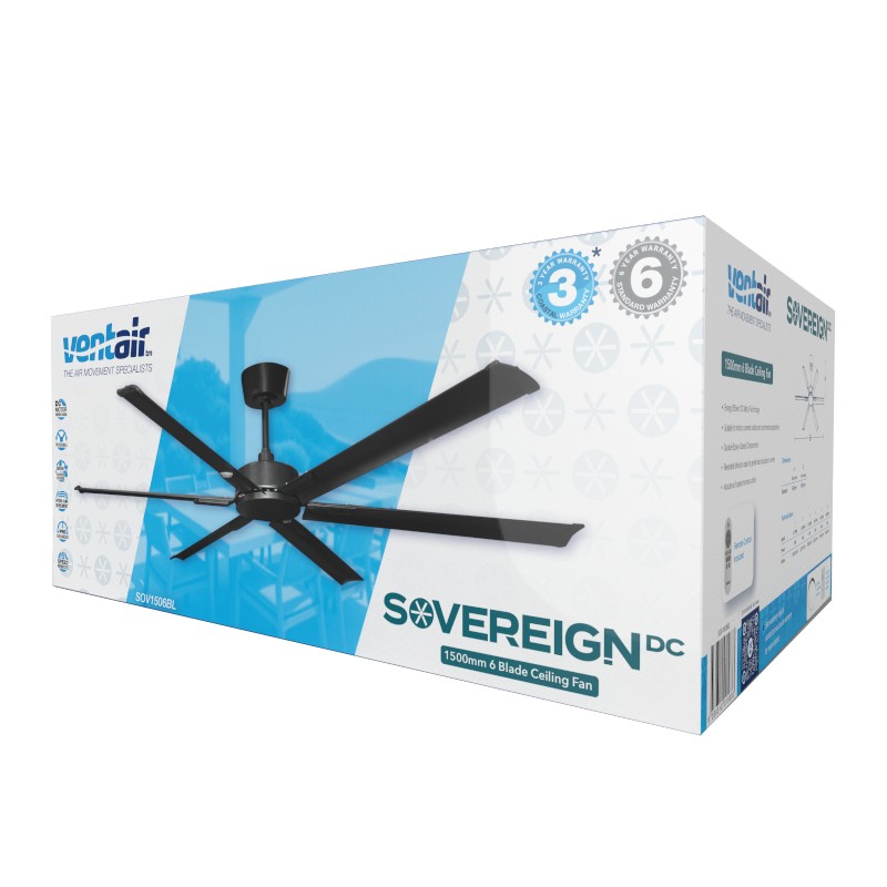 SOVEREIGN DC - 1500mm 6 Blade DC Ceiling Fan - 6 speed Remote Included - Black - Indoor/Covered Outdoor - High Airflow